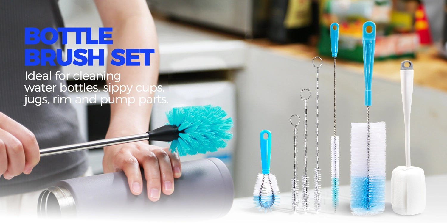 Complete 6-piece bottle brush set with 14″ long stainless steel handle, 3 straw brushes, and a 3-in-1 bottle cleaning brush. Perfect for water bottles, baby bottles, and narrow containers.