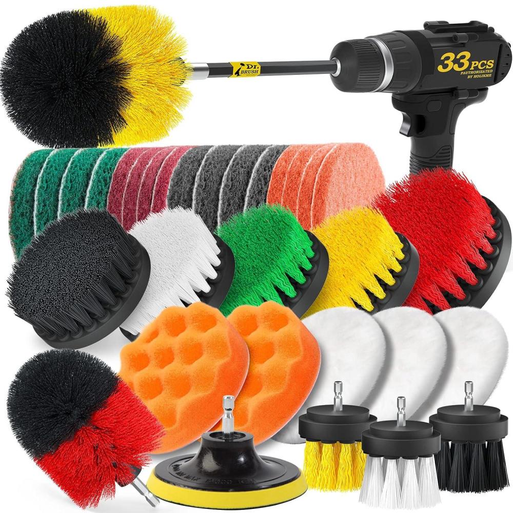 Holikme 33piece Drill Brush Attachments Set, Scrub Pads Sponge, Power Scrubber Brush with Rotate Extend Long Attachment All purpose Clean for Grout, Tiles, Sinks, Bathtub, Bathroom, Kitchen Automobile
