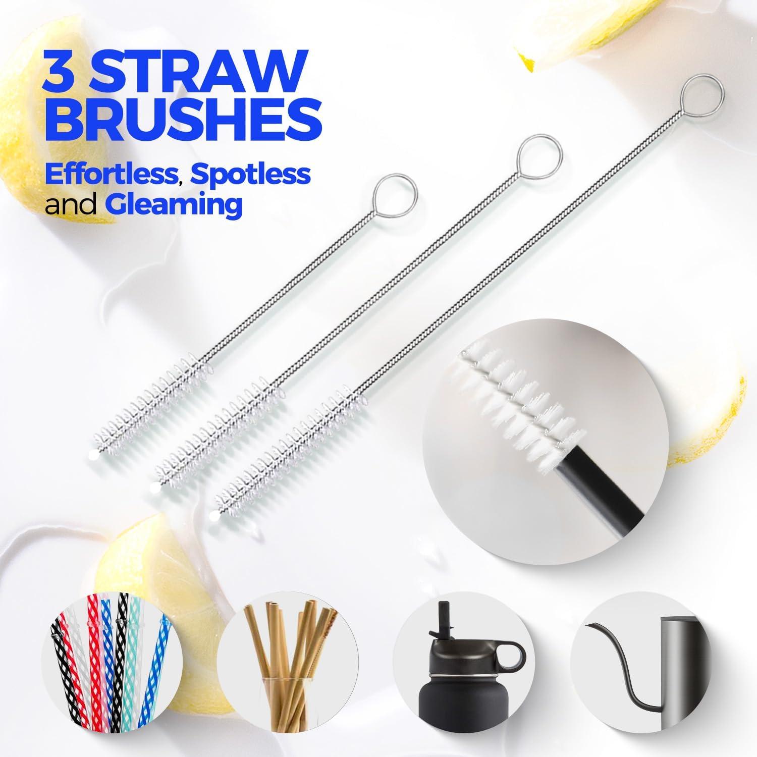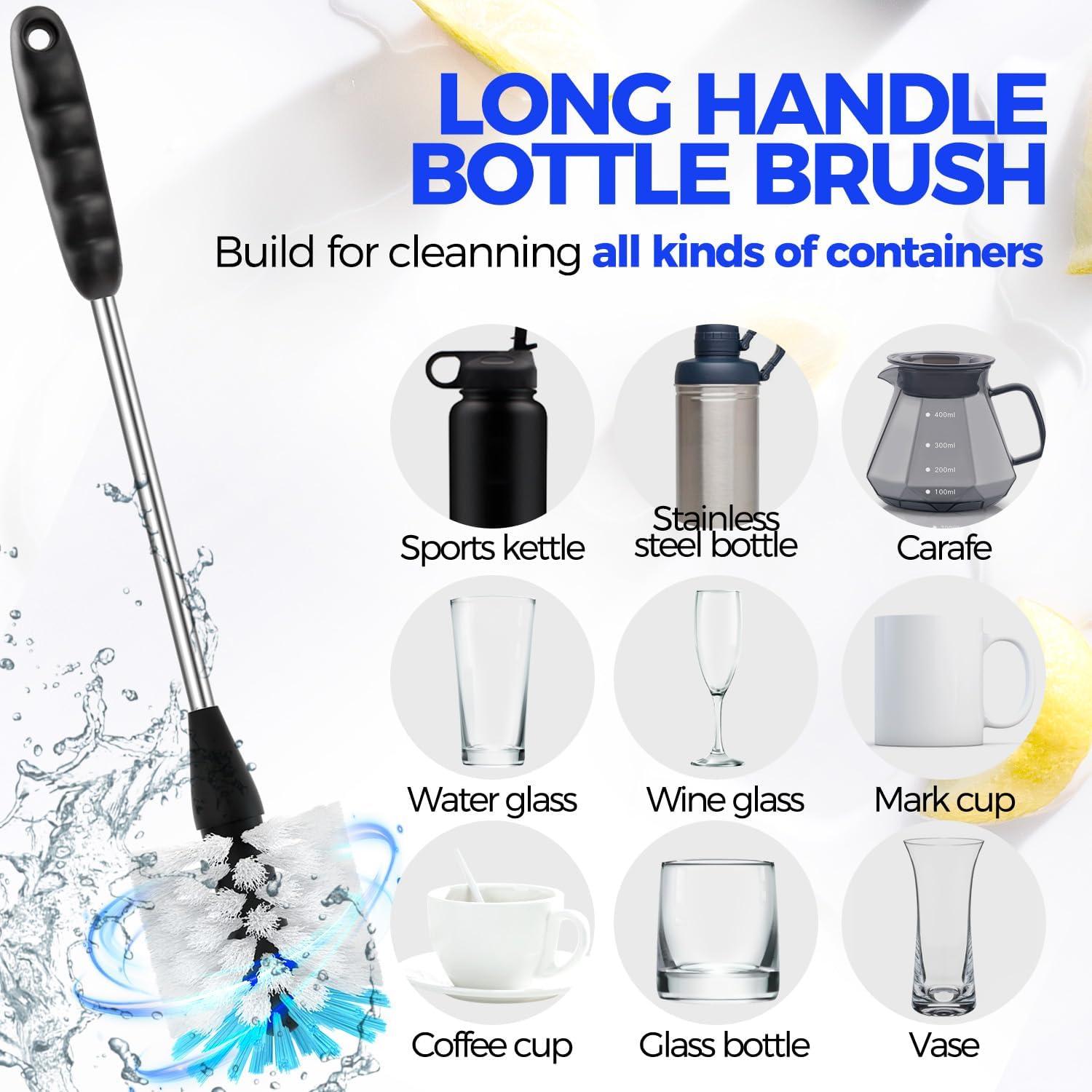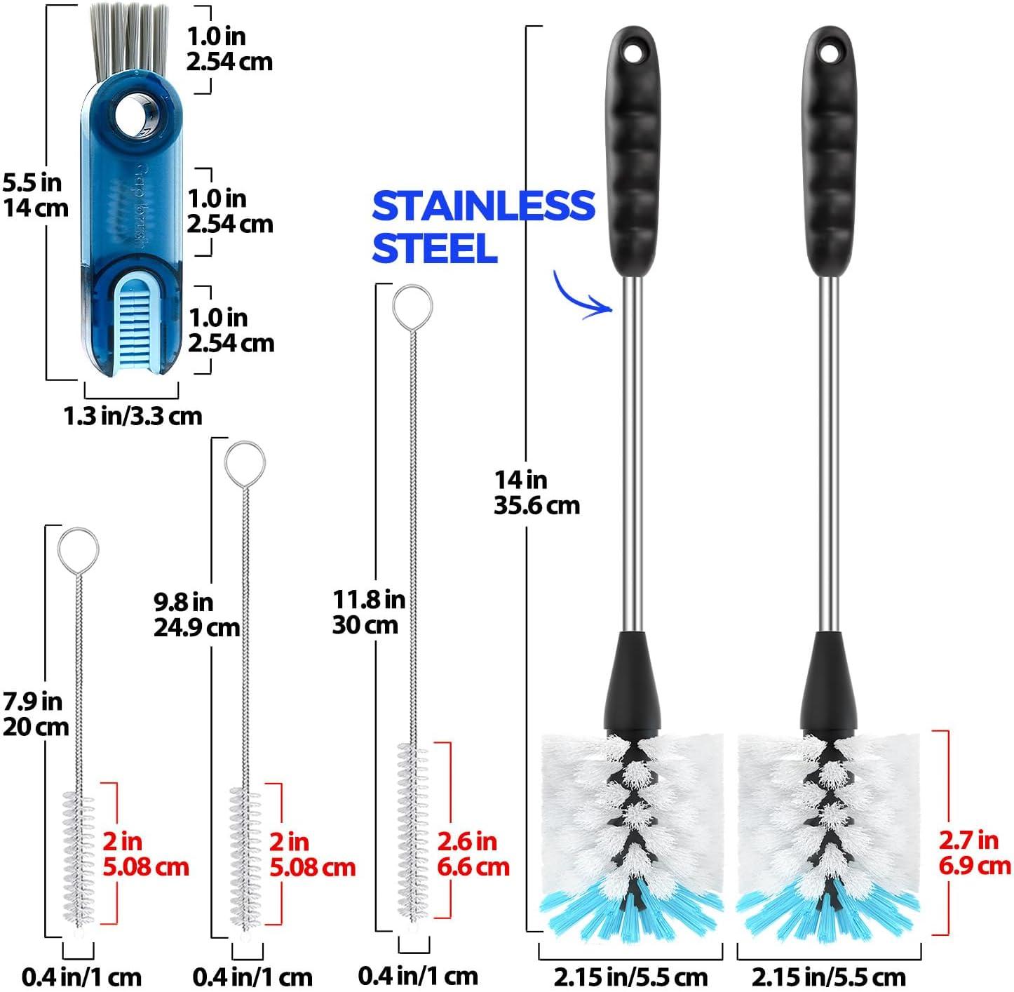 𝟲 𝗣𝗔𝗖𝗞 𝗕𝗢𝗧𝗧𝗟𝗘 𝗕𝗥𝗨𝗦𝗛 𝗦𝗘𝗧: Includes 2×14″ bottle brushes with stainless handle, 3×straw brushes, 1×3-in-1 multifunctional brush. With this complete set of cleaning tools, you'll have everything you need to keep your drinkware sparkling clean and ready to use.