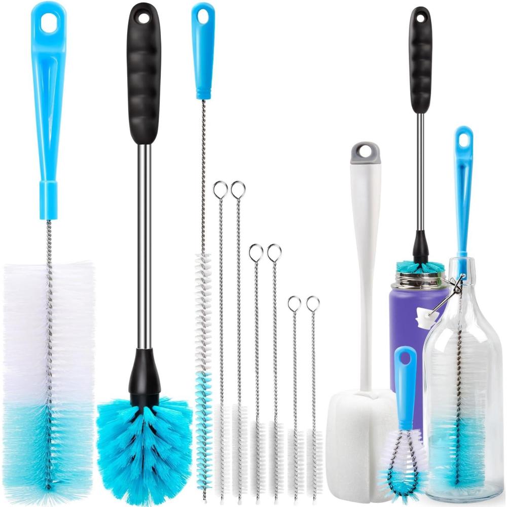 Bottle cleaning brushes with multiple usage includes 7.9-12.5 inches straw tube cleaning lab brushes, 16 inches long handle beer bottle brush, 14 inches sports water bottle brush, 10 inches multifunction sponge brush and 4.3 inches spout cleaning brush; You can hang them on hook for drying and storage.